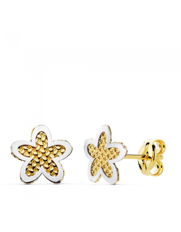 Pendientes Bicolor Oro 18kt Flor -7 x 7mm