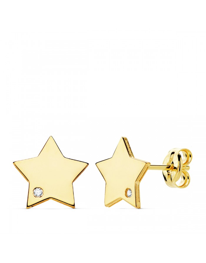 Pendientes de Estrella con piedra, fabricados en Oro Amarillo 18KT con un acabado Brillo. Estos pendientes de forma Estrella son ideales para niñas y mujeres, y pueden lucirse perfectamente en cualquier ocasión.