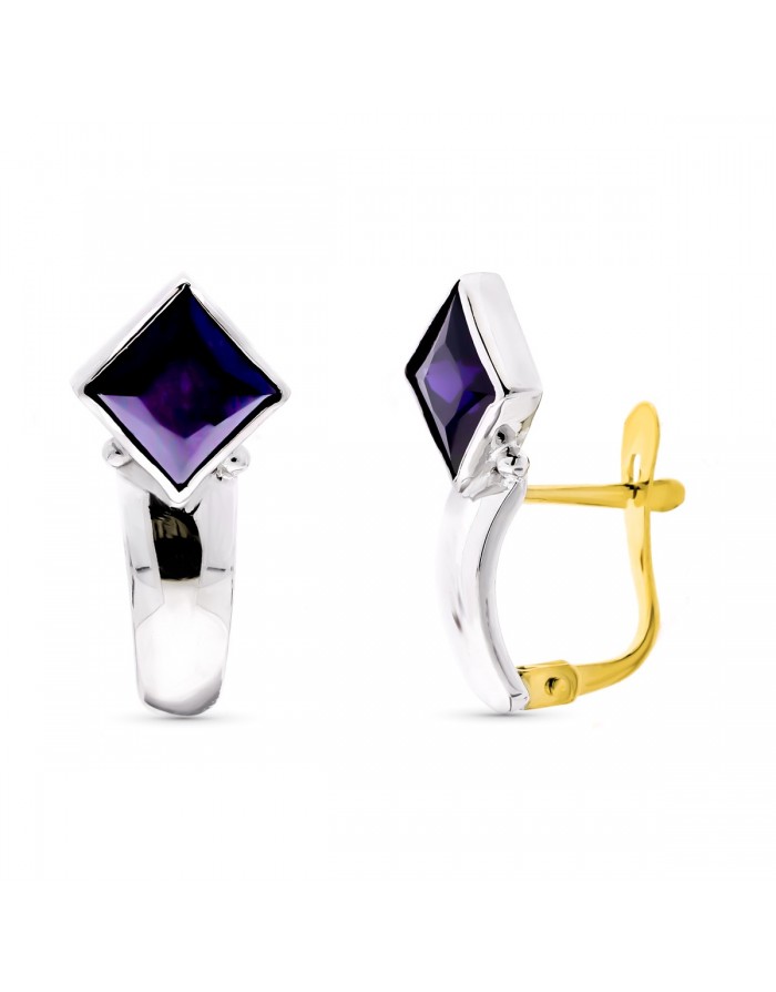 Pendientes hechos con Oro Amarillo 18K y con acabado en bicolor de la marca Joyas Armaan con cierre Catalán. La piedra del pendiente es semipreciosas de color morado.