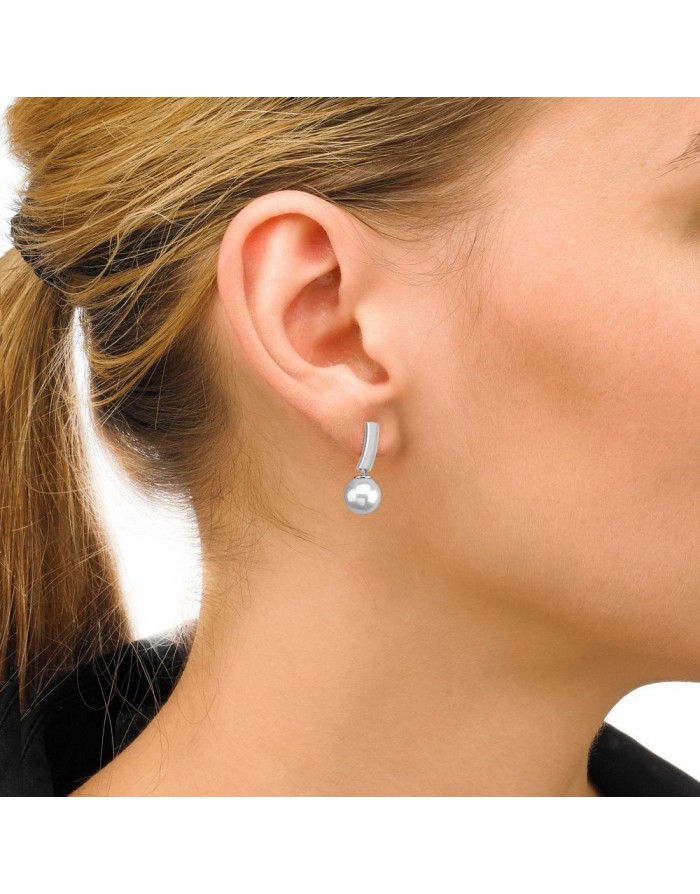 Pendientes de perlas hechos con Plata de ley y con acabado en Rodio de la marca Majorica con cierre a presión. Esta joya está hecha con perla redonda de color blanco y un diámetro de 8 mm.