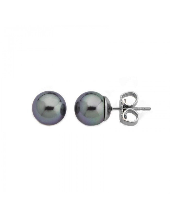 Pendientes de perlas hechos con Plata de ley y con acabado en Rodio de la marca Majorica con cierre presión de mariposa. Esta joya está hecha con perla redonda de color gris y un diámetro de 10 mm.