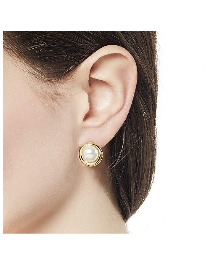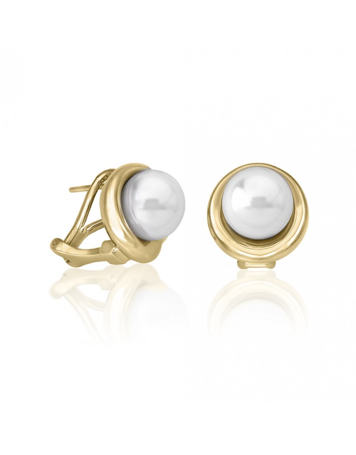 Pendientes de perlas hechos con Plata de ley y con acabado en Baño de oro de la marca Majorica con cierre omega. Esta joya está hecha perlas redonda de color blanco y un diámetro de 10 mm.