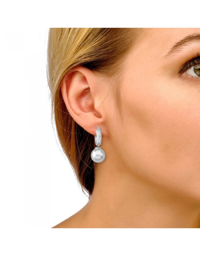 Pendientes de perlas hechos con Plata de ley y con acabado en Rodio de la marca Majorica con cierre broche de joyería. Esta joya está hecha con perla redonda de color blanco y un diámetro de 10 mm.