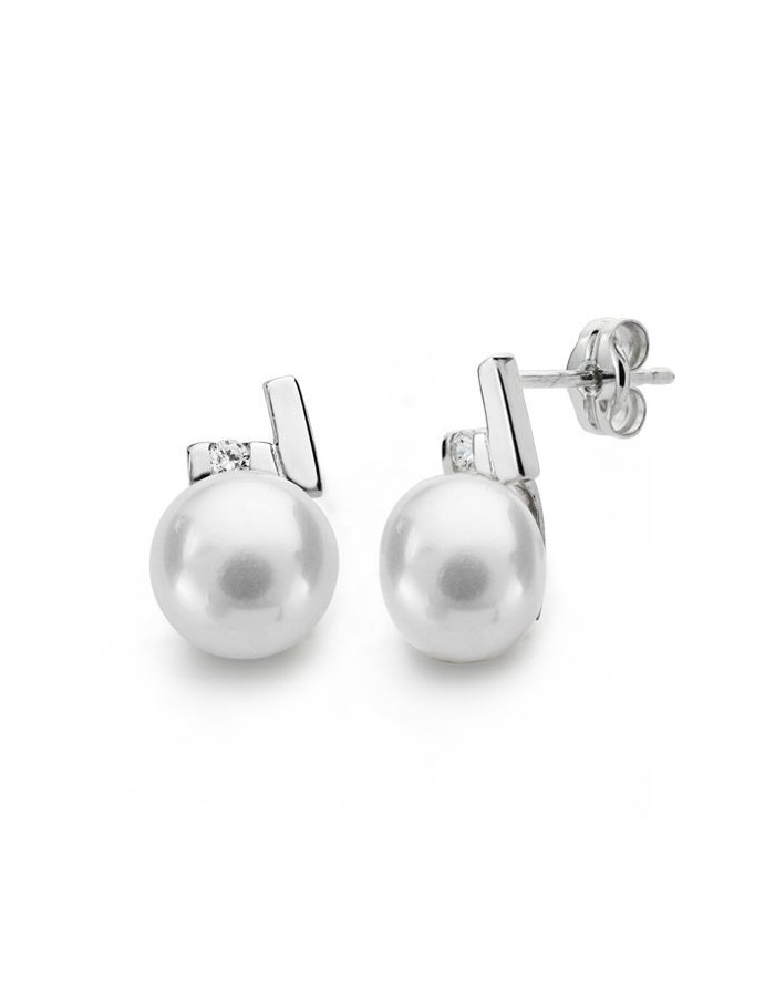 Pendientes de Oro Blanco de 18KT con Perla y Piedra -12 X 8mm