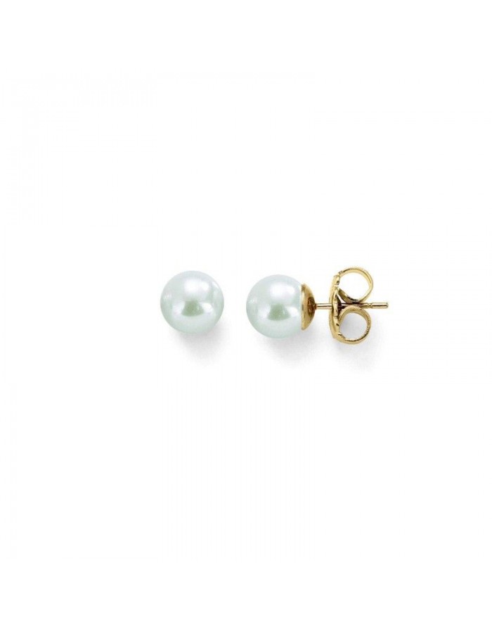 Pendientes de perlas hechos con Plata de Ley y con acabado en Baño de Oro de 18Kt de la marca Majórica con cierre a presión. Esta joya está hecha con perla redonda de color blanco y un diámetro de 6 mm.