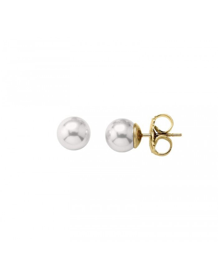 Pendientes de perlas hechos con Plata de ley y con acabado en Baño de Oro de 18Kt de la marca Majorica con cierre a presión. Esta joya está hecha con perla redonda de color blanco y un diámetro de 9 mm.