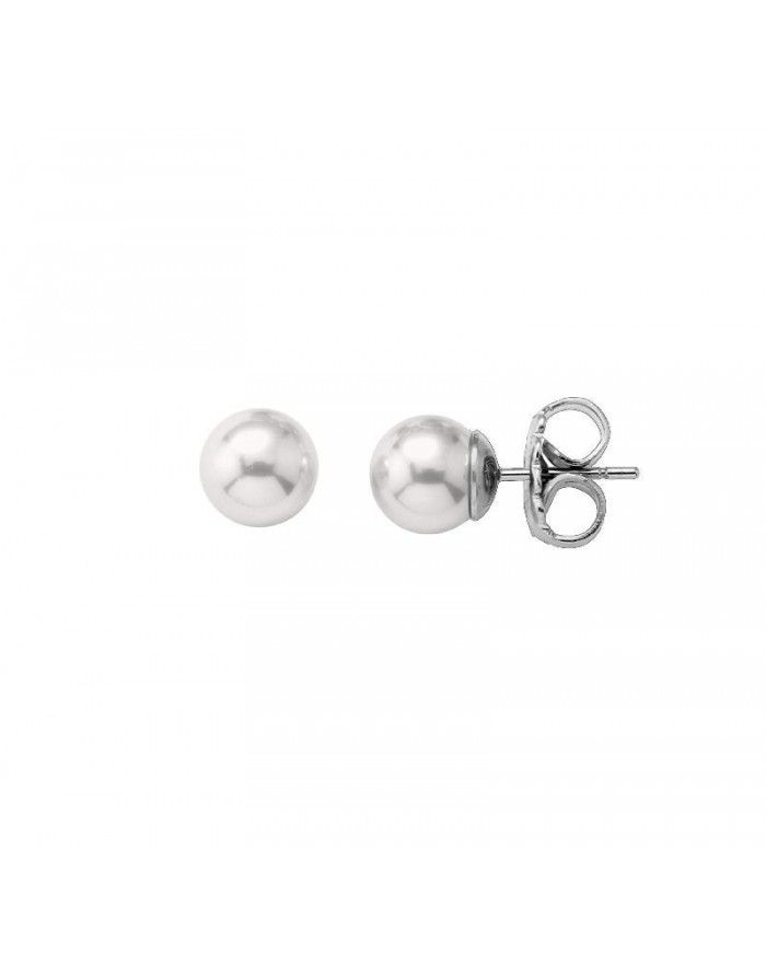 Pendientes de perlas hechos con Plata de ley y con acabado en Rodio de la marca Majorica con cierre a presión. Esta joya está hecha con perla redonda de color blanco y un diámetro de 9 mm.