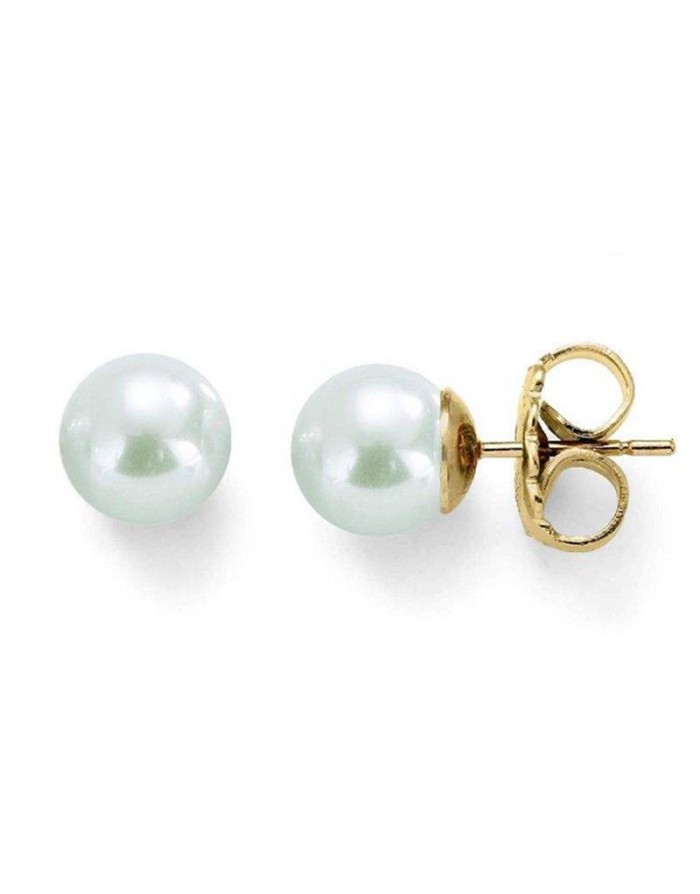 Pendientes de perlas hechos con Plata de ley y con acabado en Baño de Oro de 18Kt de la marca Majorica con cierre a presión. Esta joya está hecha con perla redonda de color blanco y un diámetro de 12 mm.
