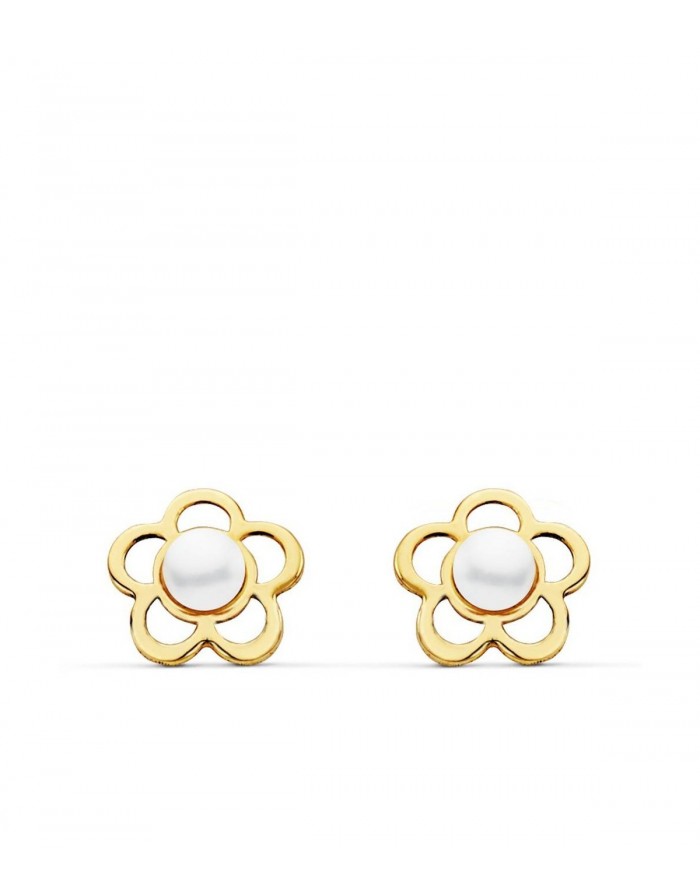 Pendientes de perlas en forma de Flor hechos con Oro Amarillo 18K de la marca Joyas Armaan con cierre de rosca.