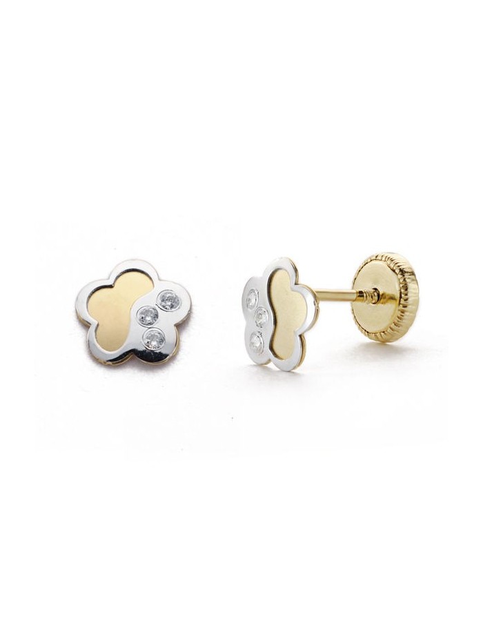 Pendientes en forma de flor hechos con Oro Amarillo 18K y con acabado en bicolor de la marca Joyas Armaan con cierre de rosca. La piedra del pendiente es circonitas de color Transparentes.
