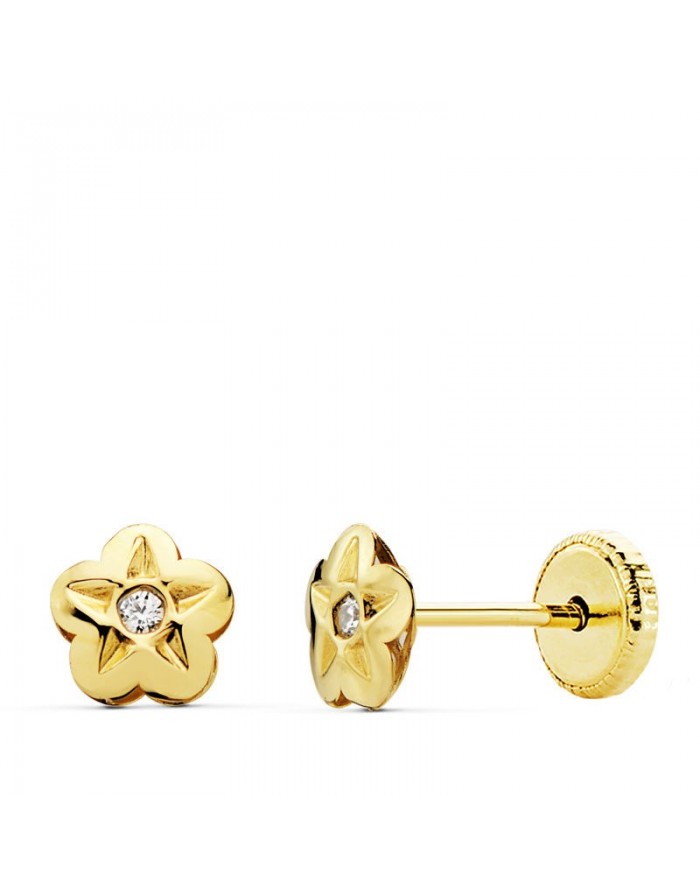 Pendientes Flor tallada con piedra central en Oro 18Kt -5mm