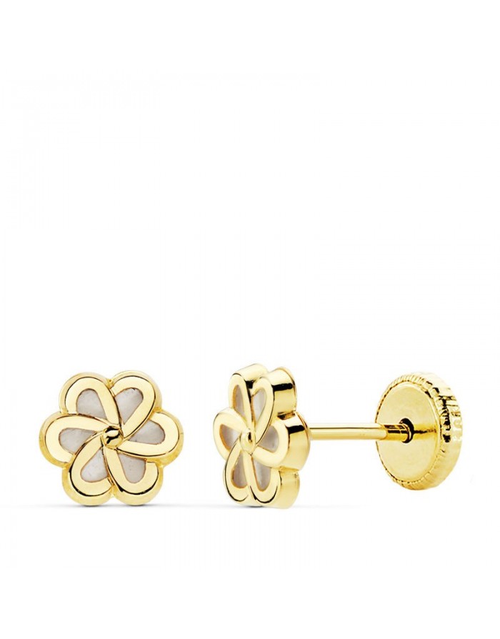 Pendientes en forma de Flor hechos con Oro Amarillo 18K y con acabado en Brillo de la marca Joyas Armaan con cierre de rosca.