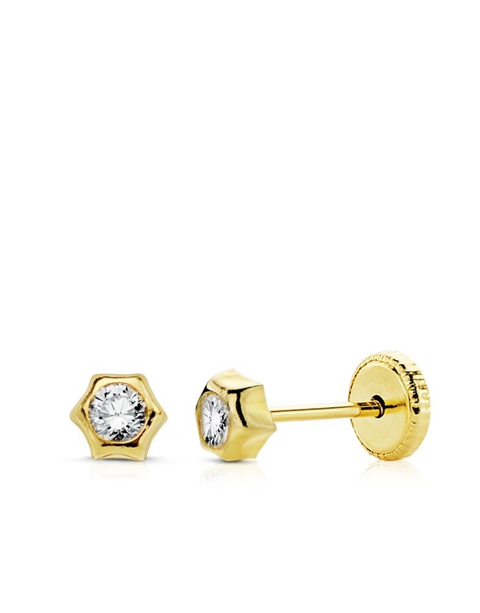 Pendientes hechos con Oro Amarillo 18K de la marca Joyas Armaan con cierre de rosca. La piedra del pendiente es circonitas de color transparente.