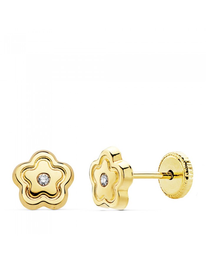 Pendientes Bebé en Oro de 18Kt flor tallada y circonita
