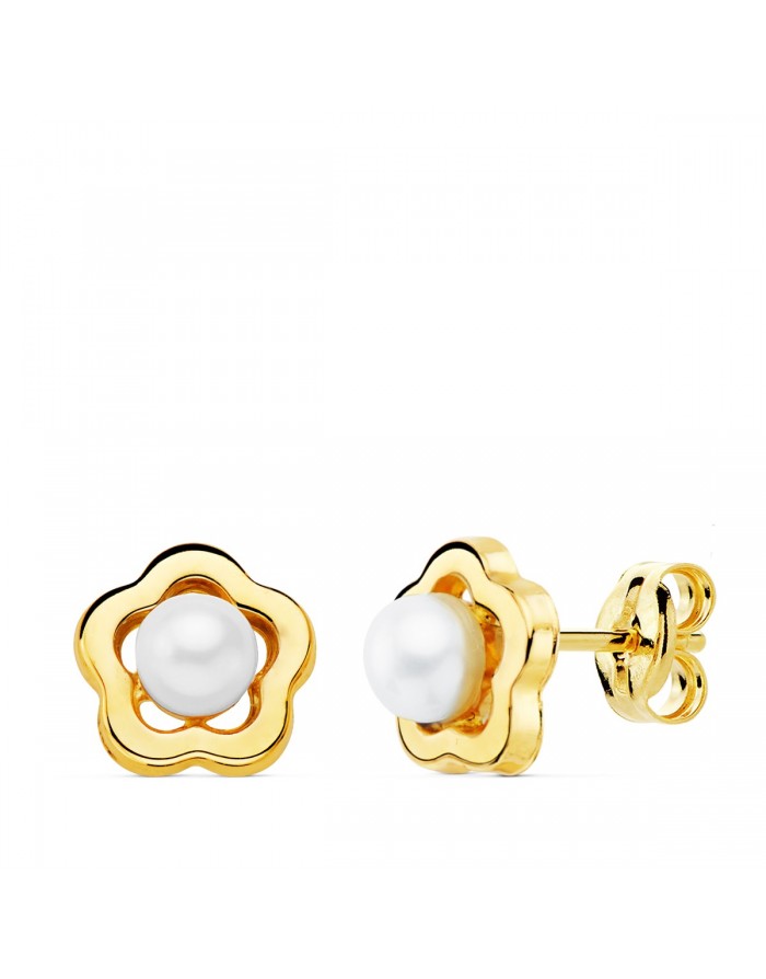 Pendientes de perlas en forma de Flor hechos con Oro Amarillo 18K y con acabado en Brillo de la marca Joyas Armaan con cierre a presión. Esta joya está hecha con perla redonda de color blanca y un diámetro de 4mm.