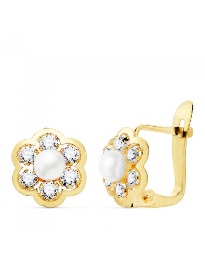 Pendientes de perlas en forma de Flor hechos de Oro Amarillo 18KT de la marca Joyas Armaan con cierre Catalán. Esta joya está hecha con perla redonda de color blanca . La piedra del es circonitas de color Transparentes.