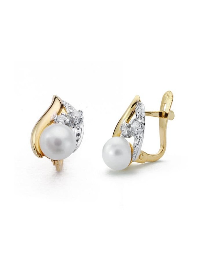 Pendientes para niña de Oro Amarillo 18KT de la marca Joyas Armaan con cierre Catalán. Esta joya está hecha con perla redonda de color blanco. En su diseño destaca la combinación de la perla como elemento clásico y dos Circonitas en talla brillante dándole un aspecto más juvenil. Estos bonitos pendientes miden 12 x 7 miímetros.
