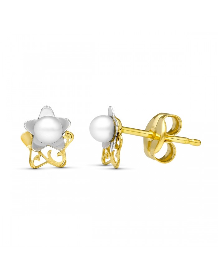 Pendientes Niña Estrellas en Bicolor con Perla Blanca en Oro de 18kt - 6 X 5mm