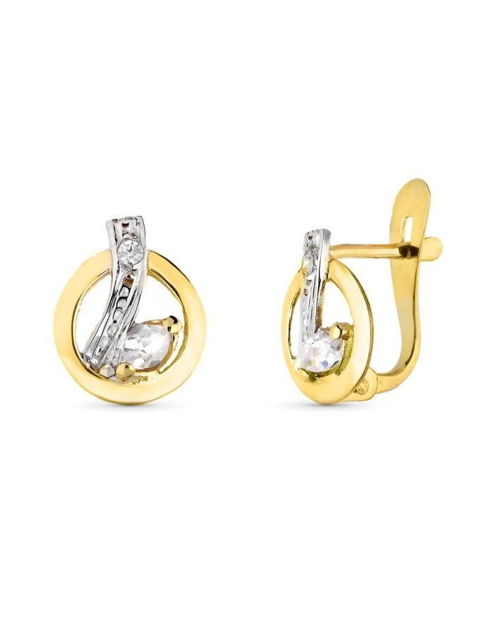Pendientes en forma de Botón hechos de Oro Amarillo 9KT y con acabado en bicolor de la marca Joyas Armaan con cierre Catalán. La piedra del pendiente es circonita de color .