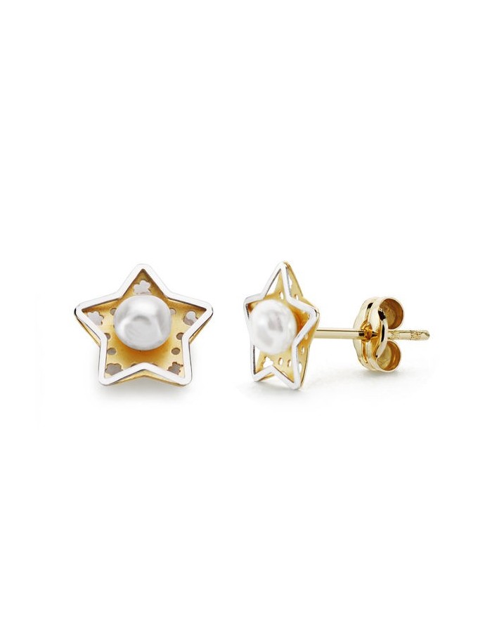 Pendientes Estrella Bicolor y Perla Blanca en Oro de 18kt -8 x 8mm