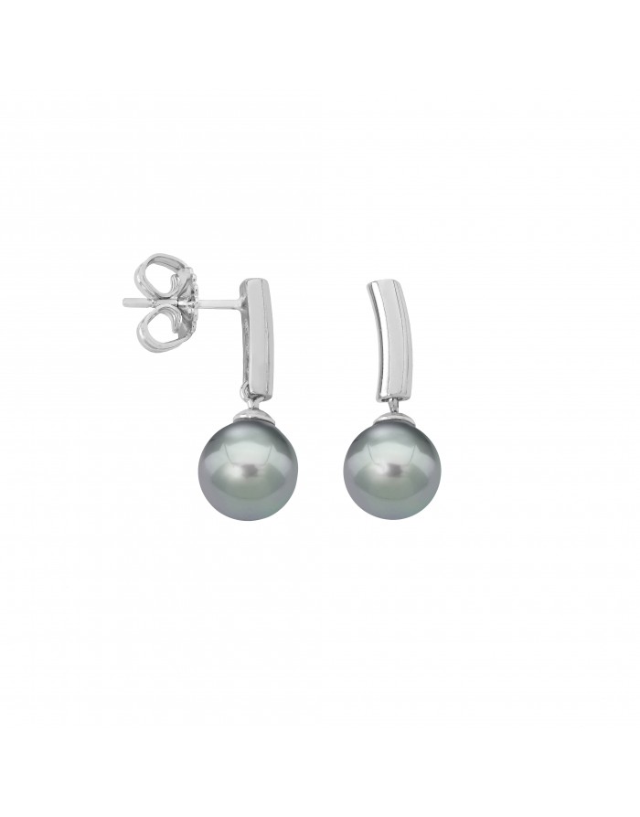 Pendientes de perlas hechos con plata de 1ªley y con acabado en Brillo-Rodio de la marca Majorica con cierre a presión. Esta joya está hecha con perla redonda de color gris y un diámetro de 8 mm.