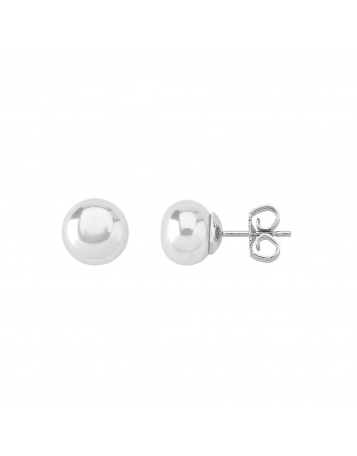 Pendientes de perlas hechos de plata 1ª Ley rodiada y con acabado en pulido de la marca Majorica con cierre a presión. Esta joya está hecha con perla mabe de color blanca y un diámetro de 10 mm.