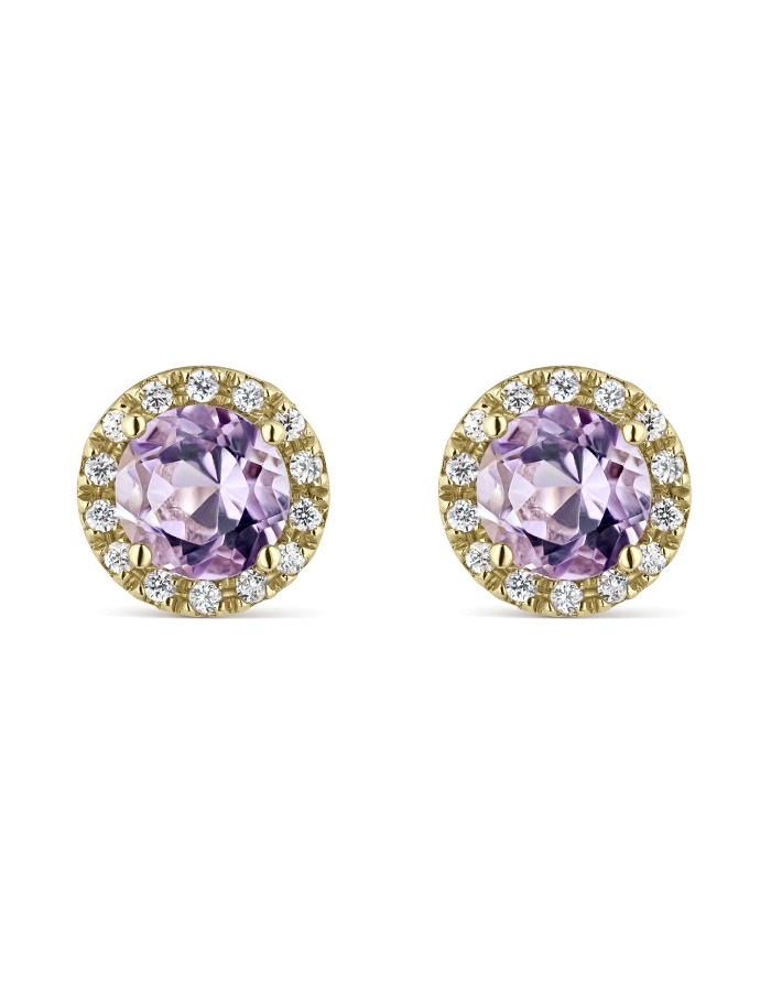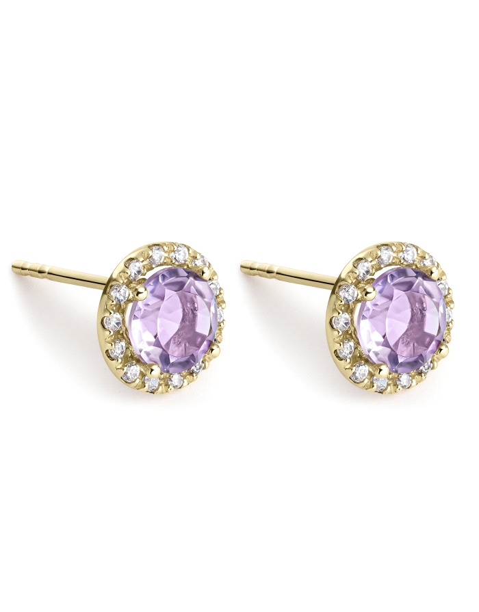 Pendientes en forma de Botón hechos de Oro Amarillo 18KT de la marca Litta Fiore con cierre a presión. La piedra del pendiente es circonita y amatista de color .
