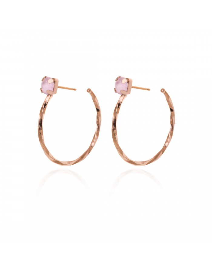 Pendientes en forma de Aro hechos con Plata de ley y con acabado en Baño de oro rosa de la marca Joyas Victoria Cruz con cierre a presión. La piedra del pendiente es cristal de swarovski de color Rosa.