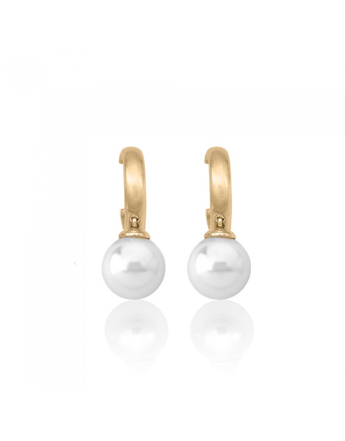 Pendientes de perlas hechos con Plata de ley y con acabado en Baño de Oro de 18Kt de la marca Majorica con cierre a presión. Esta joya está hecha con perla redonda de color blanco y un diámetro de 10 mm.