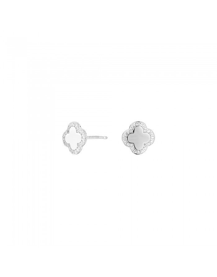 Pendientes en forma de Flor hechos con Plata de ley y con acabado en Rodio de la marca Itemporality con cierre a presión. La piedra del pendiente es circonitas de color Transparentes.