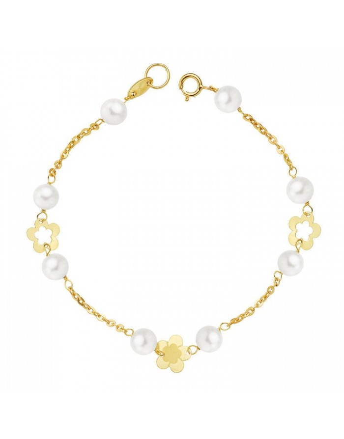 Pulsera Oro 18KT 1ª Comunión perlas y flores caladas -17cm