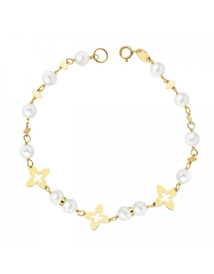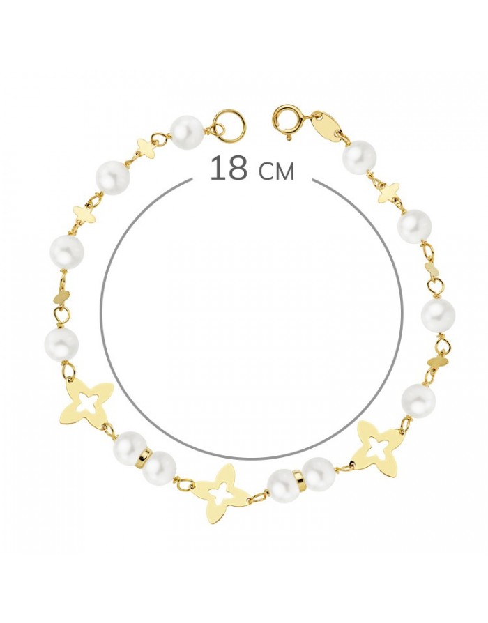 Pulsera con perlas para niña de Oro Amarillo 18K de la marca Joyas Armaan con cierre de reasa. La longitud de la Pulsera con perlas es de 18cm.