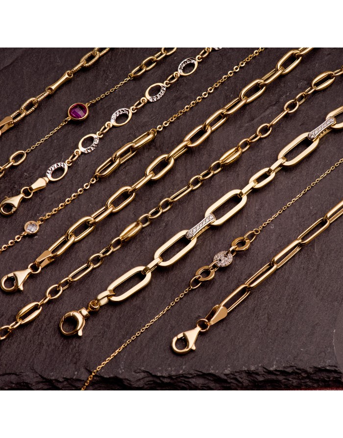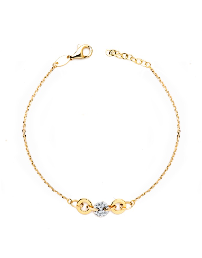 Pulsera para mujer realizada en Oro Amarillo de 18KT. Es una joya formada por una cadena de tipo forzada donde destaca en su parte central tres encadenados aros. Uno de ellos tiene una destacada terminación en bicolor y Circonitas engastadas en grano, aportando una sutil y a la vez sorprendente luz a la joya. Tiene un seguro y cómodo cierre de mosquetón y mide 19 cm de largo.