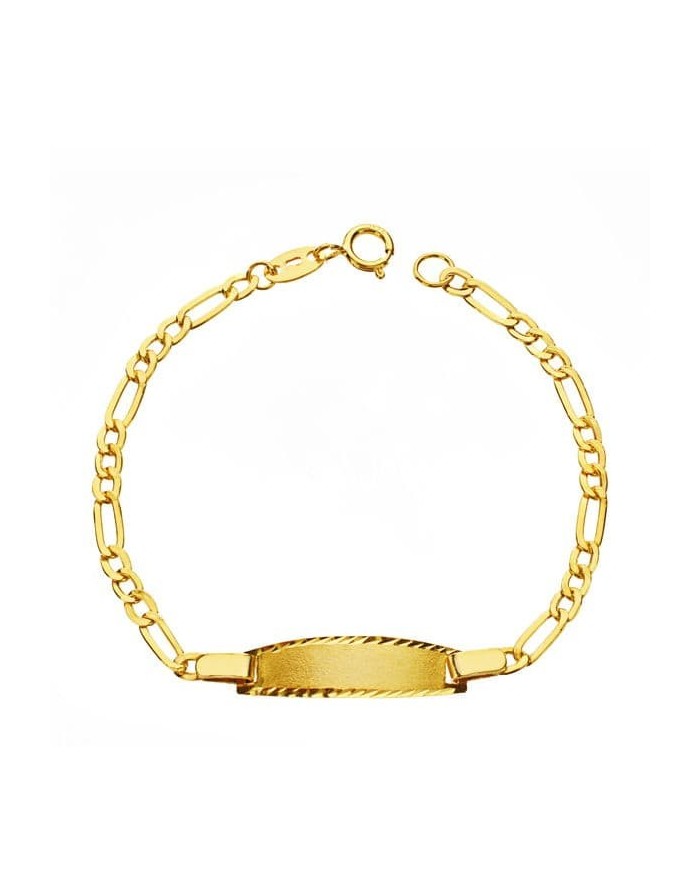 Esclava para bebé de Oro Amarillo de 9KT de la marca Joyas Armaan. El acabado de la esclava es pulido en sus eslabones y presenta un tallado en los bordes de la plaquita para grabar. Tiene una longitud de 14 cm.