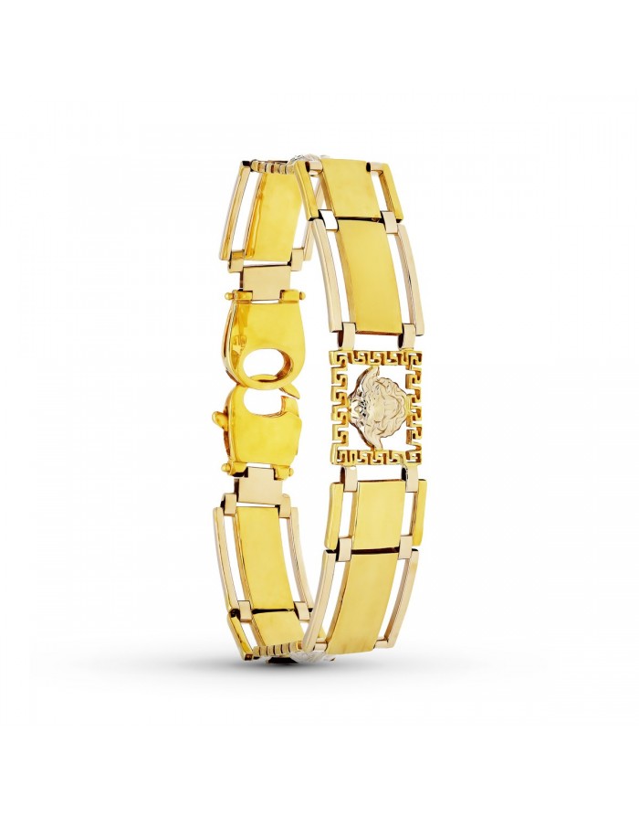 Pulsera para hombre de Oro Amarillo 18KT de la marca Joyas Armaan. Esta joya está hecha con eslabones rectangulares en Oro Amarillo y Oro Blanco, y en el centro la llamativa figura y símbolo de la mitología griega que protege de los espíritus malvados, la Diosa Medusa. Esta silueta de la Gran Diosa aparece enmarcada con un sorprendente dibujo en Greca en Oro Amarillo. El peso aproximado de esta lujosa joya es de 29,35 grs.