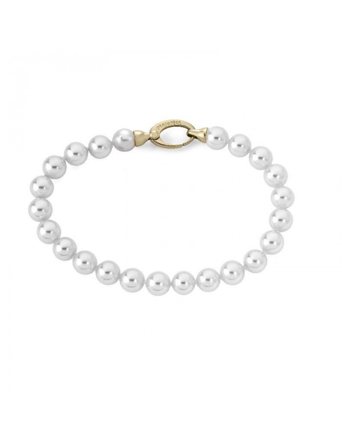 Pulsera con perlas para mujer de Plata de ley y con acabado en Baño de Oro de 18Kt de la marca Majorica con cierre de mosquetón. La longitud de la Pulsera con perlas es de 19 cm.