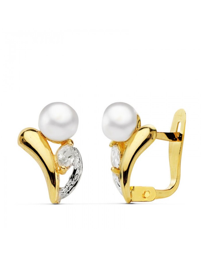 Pearl earrings made in 18K Yellow Gold by Joyas Armaan with Catalan clasp. This jewellery is made with white round pearl. The stone of the earring is transparent zirconia.