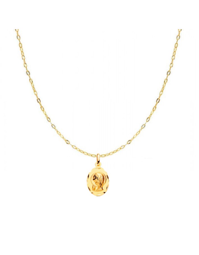 18k yellow gold (750 mils) oval shaped medallion with figure of the Virgin Mary. The medal is 19 mm high and 12 mm wide.