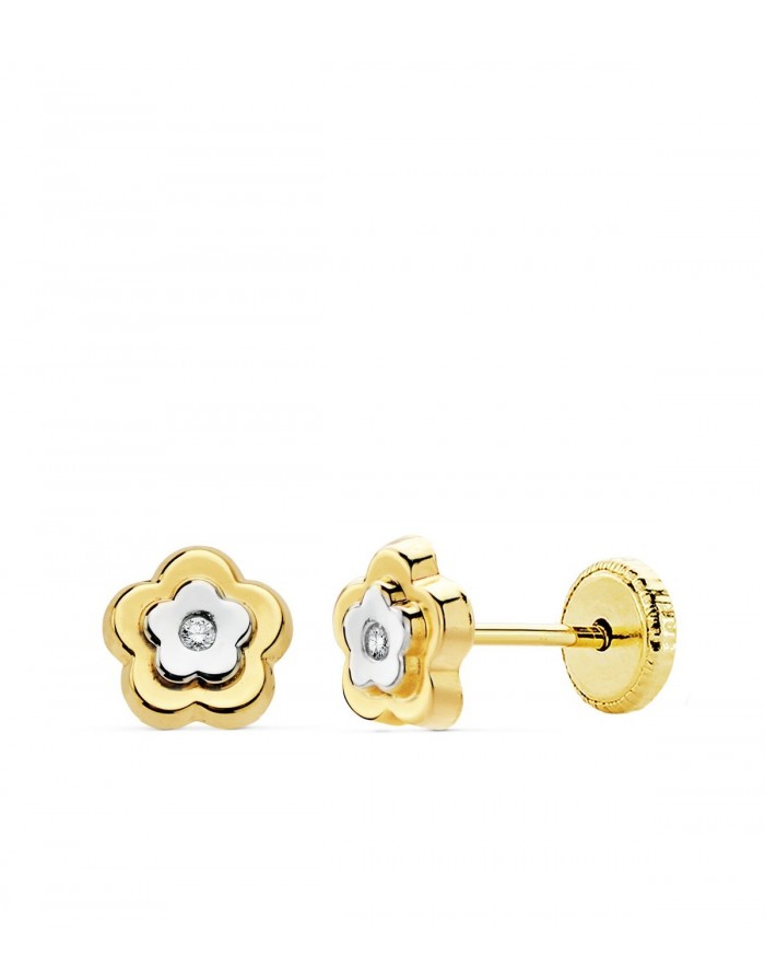 Flower-shapedearrings made in 18kt Yellow Gold and with bicolour finish by Joyas Armaan with screw clasp. The stone of the earring is transparent zirconia in brilliant cut.