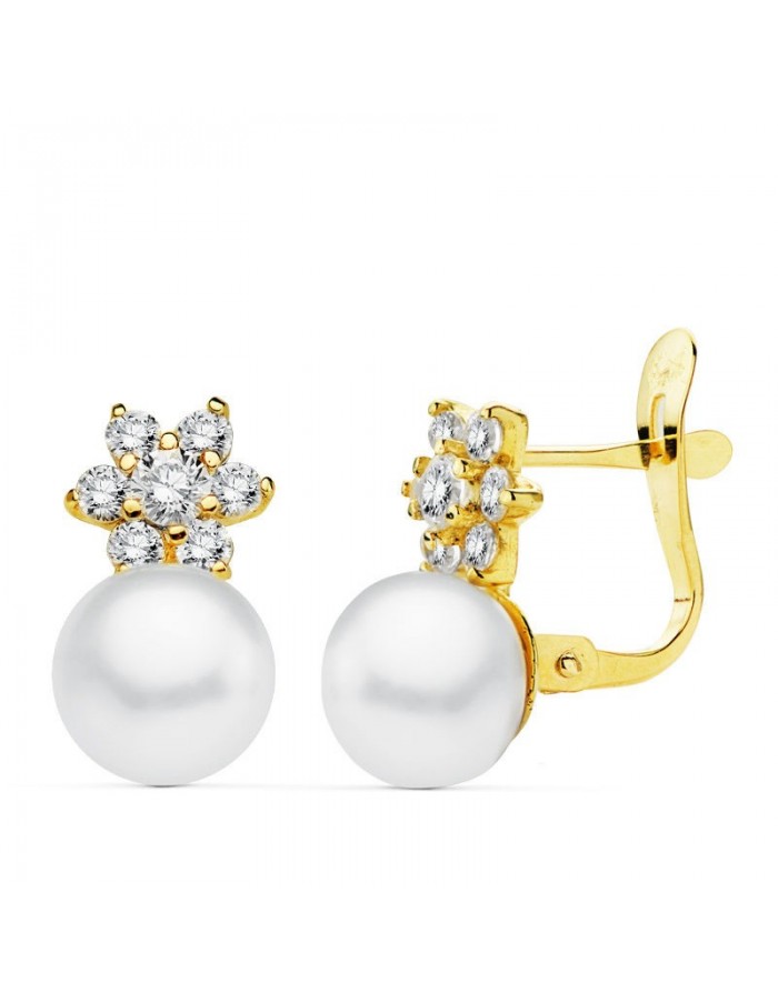 Pearl earrings made in 18K Yellow Gold by Joyas Armaan with Catalan clasp. This jewellery is made with white round pearl. The stone of the earring is transparent zirconia.