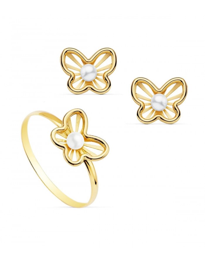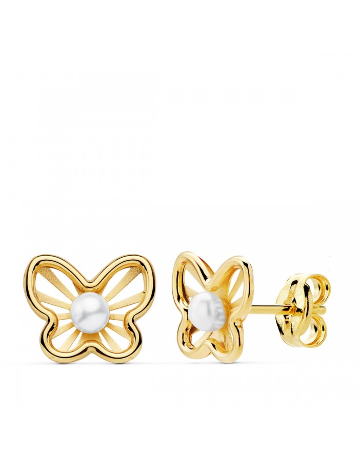 Earrings made in 18K Yellow Gold by Joyas Armaan with snap closure. Its design combines the openwork of the butterfly with a central pearl of 2.5 mm in diameter.