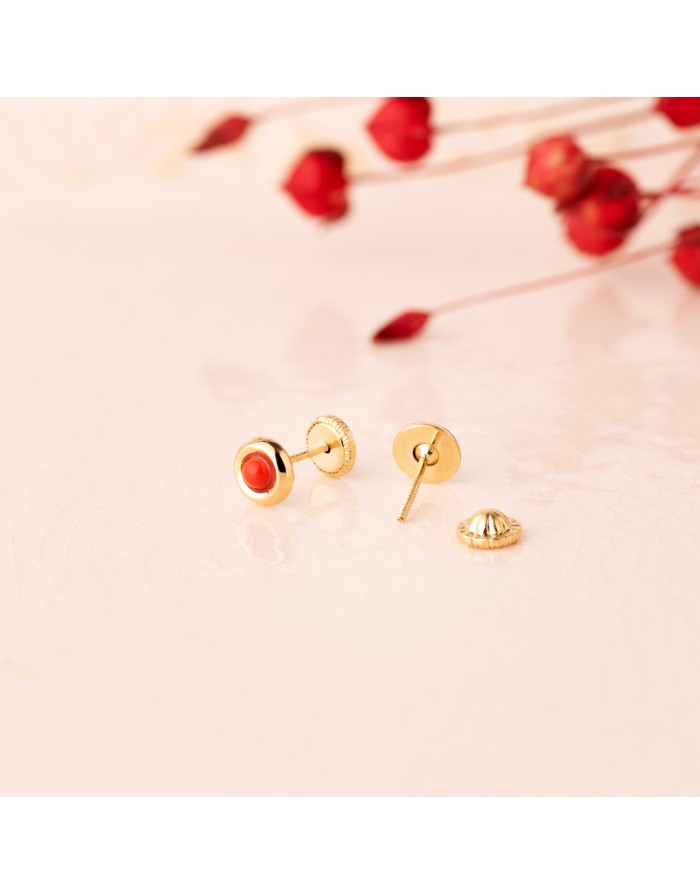 18K PENDIENTES ORO AMARILLO REDONDOS CON CORAL DE 2MM. ANCHO: 5MM. CIERRE TUERCA