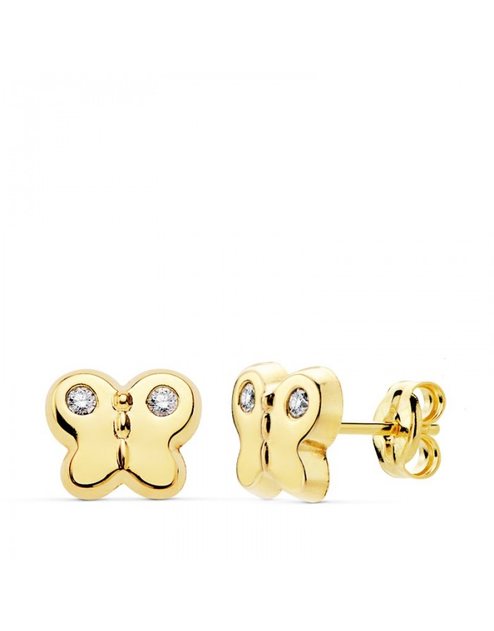 Earrings in the shape of a butterfly made in 18K Yellow Gold from the brand Joyas Armaan with snap closure. The stone of the earring is transparent zirconia.