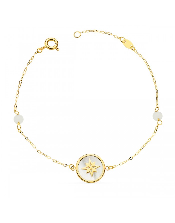 Bracelet with Jade Beads and Wind Rose on Mother of Pearl 18Kt Gold