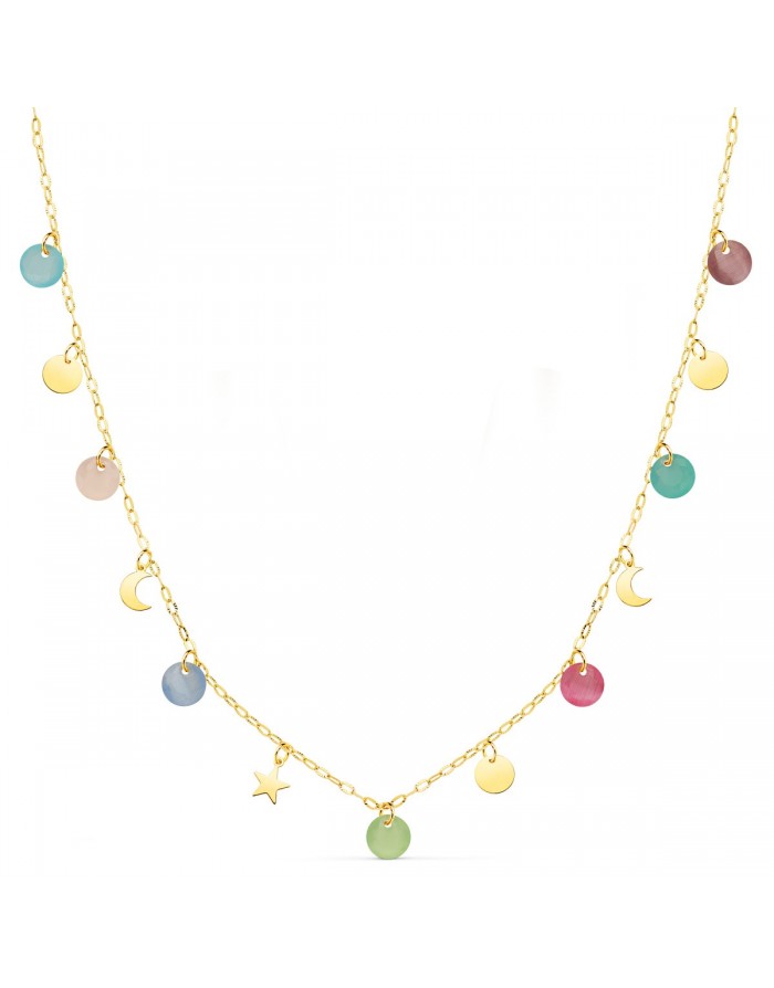 Necklace in 18K Yellow Gold by Joyas Armaan. This choker has a 40 cm long and has a loop clasp. The stones that adorn it are multicoloured zircons. It is a choker designed especially for women.