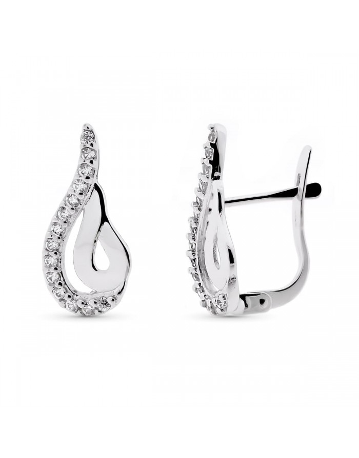 Pendientes en forma de hoja hechos de Oro Blanco 9KT de la marca Joyas Armaan con cierre Catalán. La piedra del pendiente es circonitas de color Transparentes.