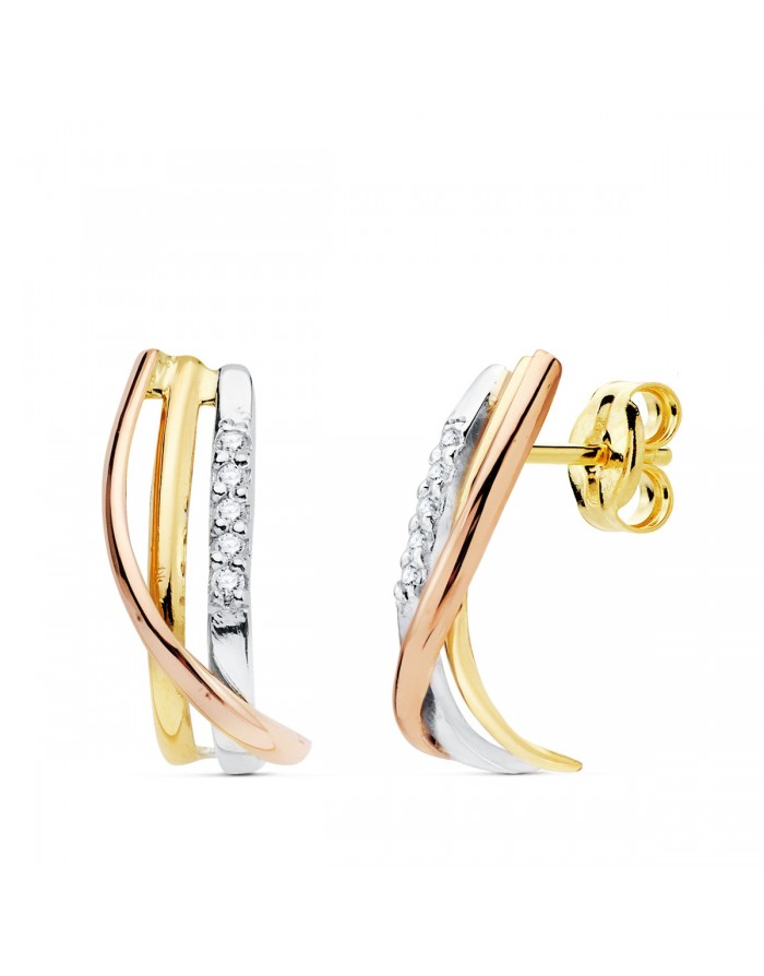 Pendientes de Oro Amarillo 18Kt con acabado tricolor, diseñados con una forma de bandas entrecruzadas. Estos pendientes destacan por su elegante y sofisticado estilo, perfecto para realzar cualquier look. Elaborados con Oro Amarillo 18Kt, cuentan con un acabado tricolor que aporta un toque de distinción.