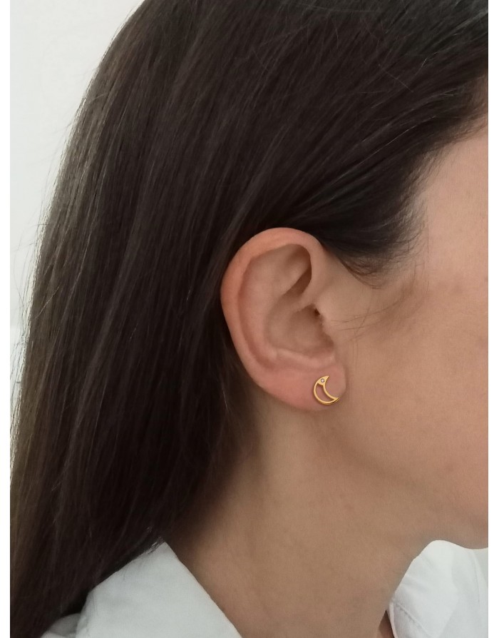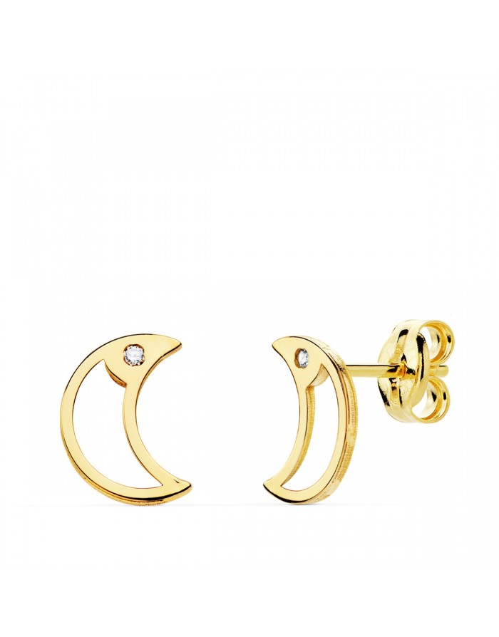 Moon shaped earrings made in 18K Yellow Gold by Joyas Armaan with snap clasp. The stone of the earring is zirconia of colour .