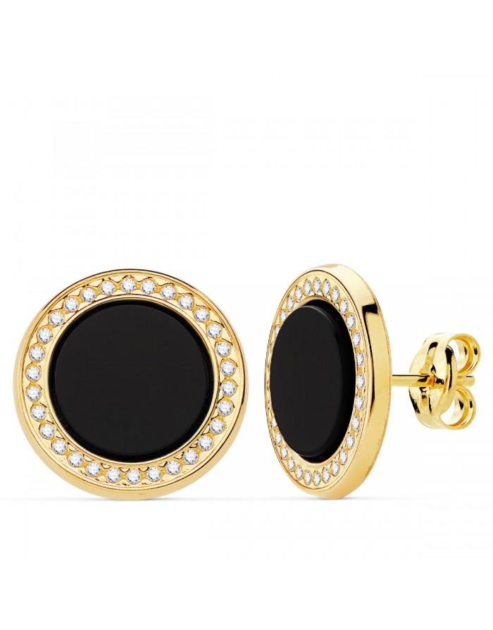Earrings for women made with 18KT Yellow Gold of the brand name Joyas Armaan with snap closure. The stones of these earrings are onyx and a crown of brilliant cut zirconia set in bocel. Their diameter is 12.5 mm.