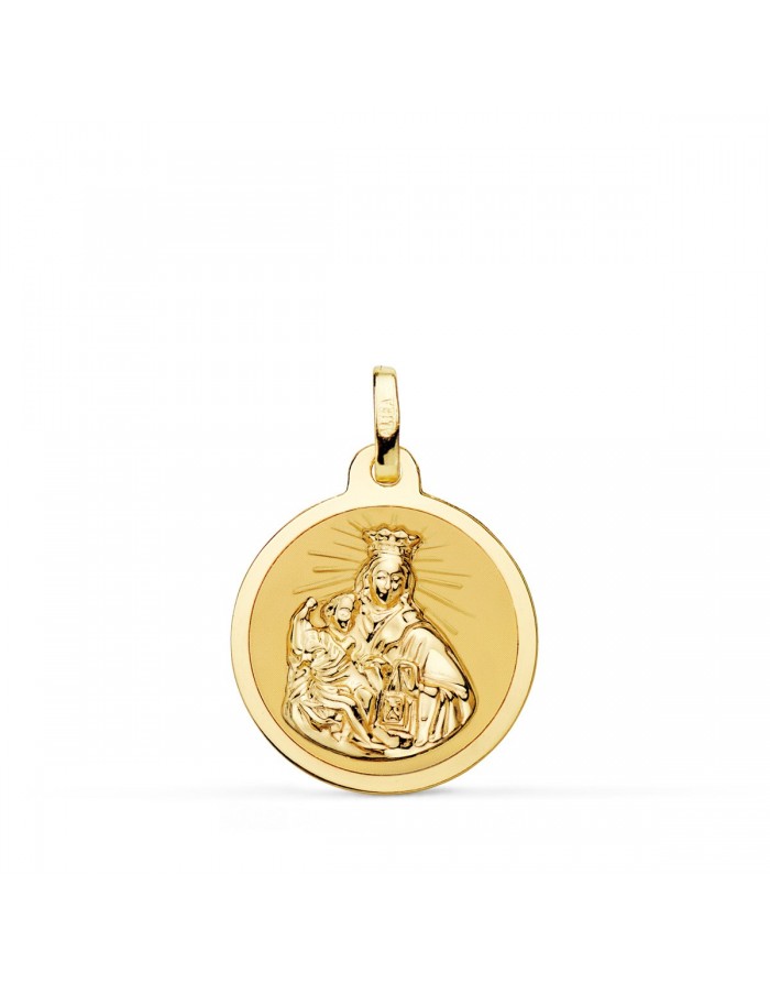 Virgin of Mount Carmel round shaped medal in 18 carat yellow gold (750 mils) and glossy finish.